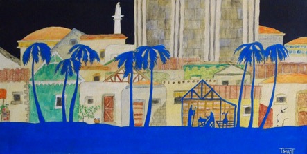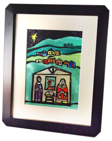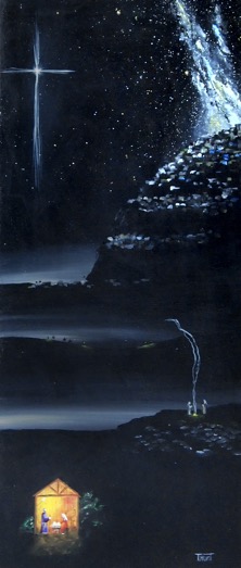 An elegant interpretation of that glorious night with suggesting of the magi and shepherds.