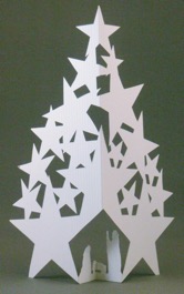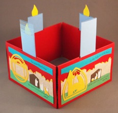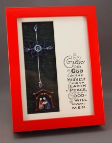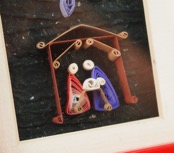 This art is created by quilling, an old art form using thin strips of paper twirled and shaped to form the star and creche.